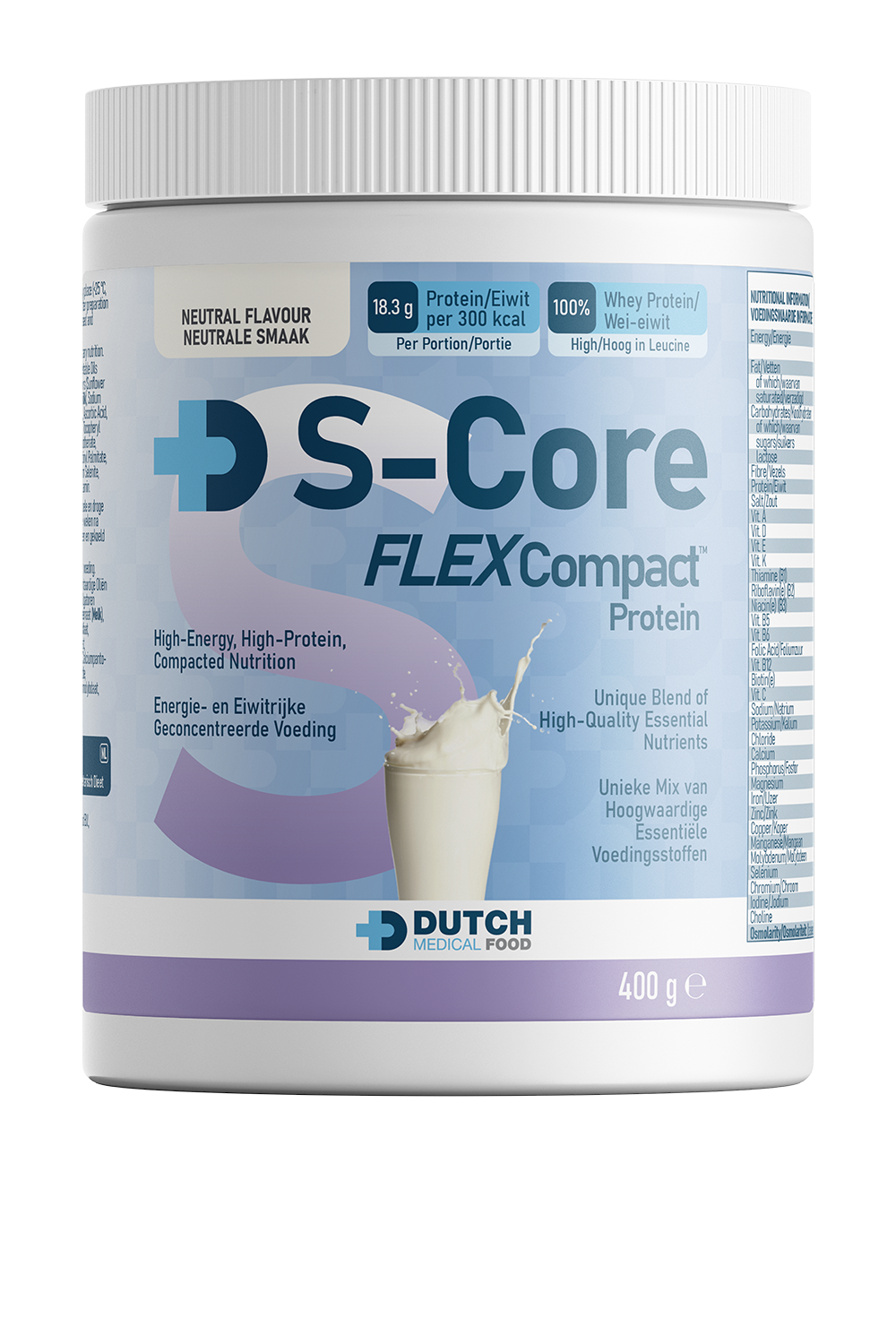S-Core FLEXCompact™ Protein is a specially designed powder for making high-density ONS >2kcal/ml. It is a high-quality Oral Nutritional Supplement (ONS) which serves as a Food for Special Medical Purposes/Medical Food for patients in need of additional calories and nutrients. S-Core FLEXCompact™ Protein is based on 100% whey protein, designed for a better taste and mouthfeel, naturally high in leucine and lower viscosity. S-Core FLEXCompact™ Protein can be used for the dietary management of patients suffering from disease-related malnutrition.