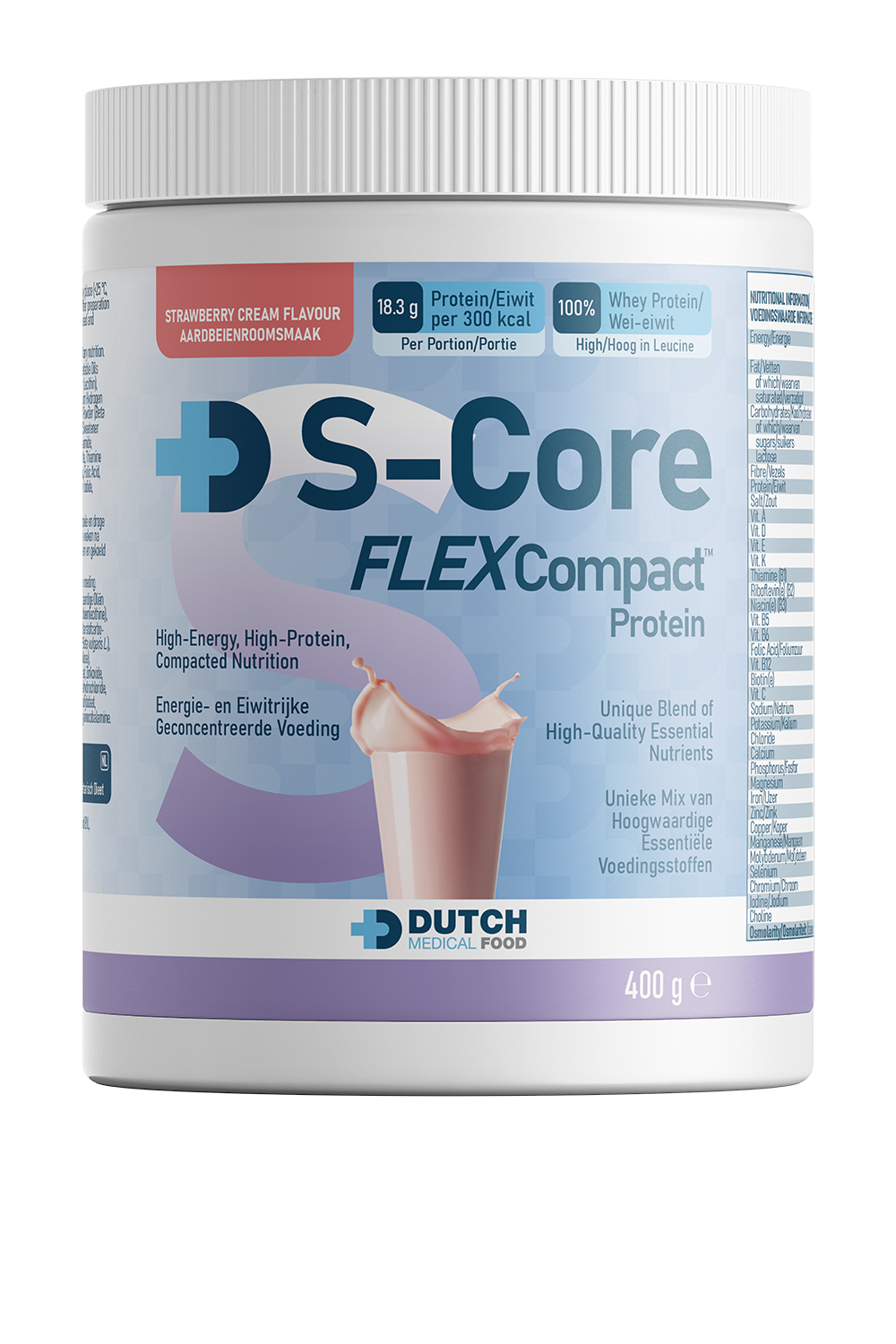 S-Core FLEXCompact™ Protein provides high-quality nutrients to prevent or replenish nutritional/nutrient deficiencies. It is specially designed to deliver a high amount of high-quality protein (29g whey protein/100g powder) and a high amount of essential fatty acids. The product provides a balanced amount of the vitamins and minerals based on latest EFSA (European Food Safety Authority) guidelines. S-Core FLEXCompact™ protein is suitable for adults. It can also be used in children >3 years, however the amount of servings will depend on the age and condition of the child. The dosage should be determined by a clinician or dietitian. The product comes in a neutral and strawberry flavour.